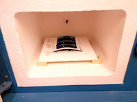 Then, carefully place in the cool kiln, making sure no pieces of glass has slipped. This final check of the unfused glass is is very important as once the temperature starts rising in the kiln, it's a bit late to be sticking your hands in to adjust something you have just spotted. Trust me, I know from experience LOL. As you can see from the first picture of the closed kiln, it was a warm day as the ambient temperature was 17 degree centigrade.